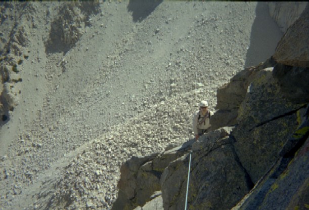 Wednesday, we got off hiking about an hour before daybreak. It's a surprisingly short approach from Lake 3 to the start of the route. Hans persuaded us to not bring ice axes, as the snow field looked short and not too steep from below. This turned out to be a problem, and the experienced mountaineer might wonder about this decision. The only thing I can say is that it seemed a good idea at the time.