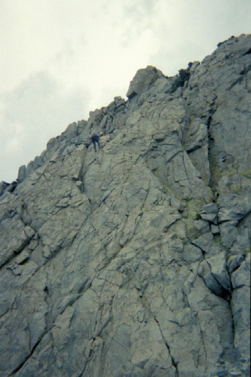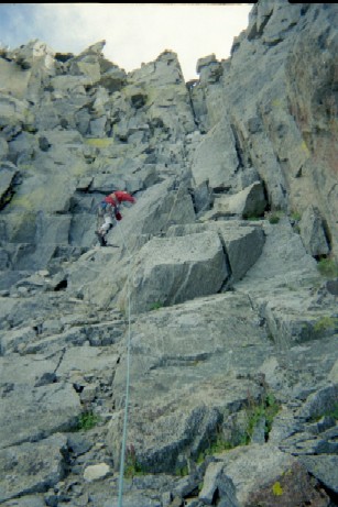 When we got up to the snowfield, it really wasn't that steep (about 30 degrees) but the snow was hard as ice. In fact, there were streaks of iced up meltoff. This was compounded by the fact that I was the only one wearing mountaineering boots - the other guys were wearing approach shoes and boots. I ended up 'leading' one pitch of snow. It's amazing what difference the ice axe makes in terms of confidence and, therefore, speed. I found myself kicking steps very meticulously. At some point, I even put in a small bollard with a long sling. What should have been a 15 minute breeze turned out to be 45 minutes of aggravation. This little situation slowed us down for more than an hour, but we were still pretty good on time.